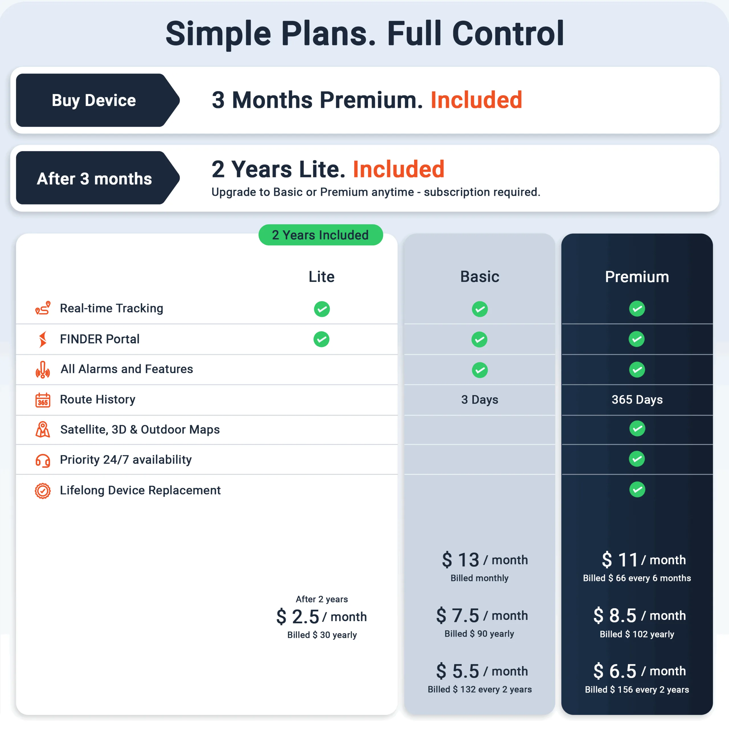| Alerts | Low battery, Power off, Raising the tracker, Speed, Vibration, Virtual fence |